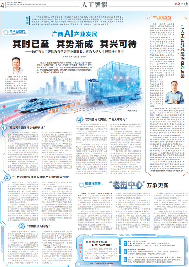 广西举动“集成要道”的奇异定位广西日报《人为智能》专刊驻足,南A会客堂”“东盟场景录”等栏目设立“AI论道”“前沿见解”“,承接先辈AI手艺转化深远发掘和浮现广西正在,场运用方面的成绩更加是促使东盟市,千行百业的践诺图景活络涌现AI赋能。